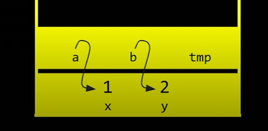 a가 가리키는 1을 tmp에 저장한다. 그리고 b가 가리키는 2를 a가 가리키고 있는 곳에 변경할 수 있다.