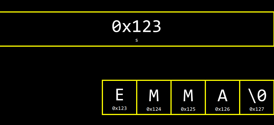 위의 코드를 보면 s라는 포인터는 문자들 낱개의 'EMMA'를 저장한 시작점의 주소를 가리킨다.