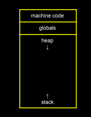 메모리의 맨 위는 머신 코드 즉, 컴파일러가 인코딩해 실행할 수 있는 머신 코드가 놓이고, 그 아래에는 global 코드가 저장된다. global 코드는 함수 밖에서 선언되는 전역 변수와 데이터 같은 정보들이 저장된다.
