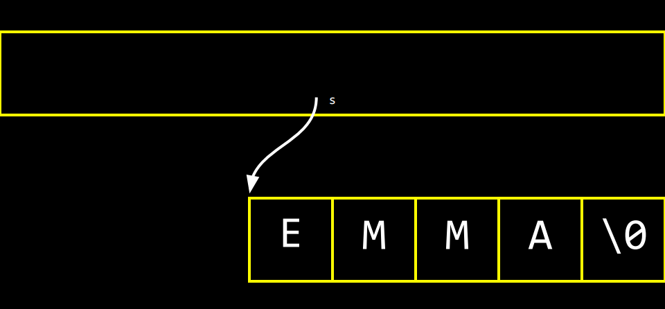 위의 코드를 보면 s라는 포인터는 문자들 낱개의 'EMMA'를 저장한 시작점의 주소를 가리킨다.