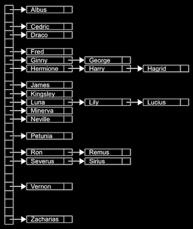 Hagrid 이름을 검색하게 되면 연결 리스트를 이용해 3번의 절차를 확인해야 한다. 테이블의 성능을 확장시키려면 알파벳 이름의 두 글자까지 늘려 Ha Hb Hc Hd... Ht Hu.. Hy Hz 두 개의 알파벳까지 저장할 수 있는 테이블을 만들면 메모리는 급격하게 필요하지만 성능은 더욱 향상될 수 있다. 해시함수에 중복되어 들어가게 되는 값들이 하나일 경우 이상적이라고 할 수 있다.