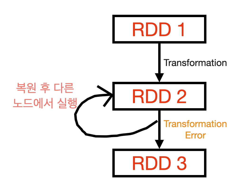 그러므로 RDD2가 RDD3으로 transformation 실행중 에러가 발생한다면 RDD2를 복원 후 다른 노드에서 다시 transformation 작업을 실행한다.