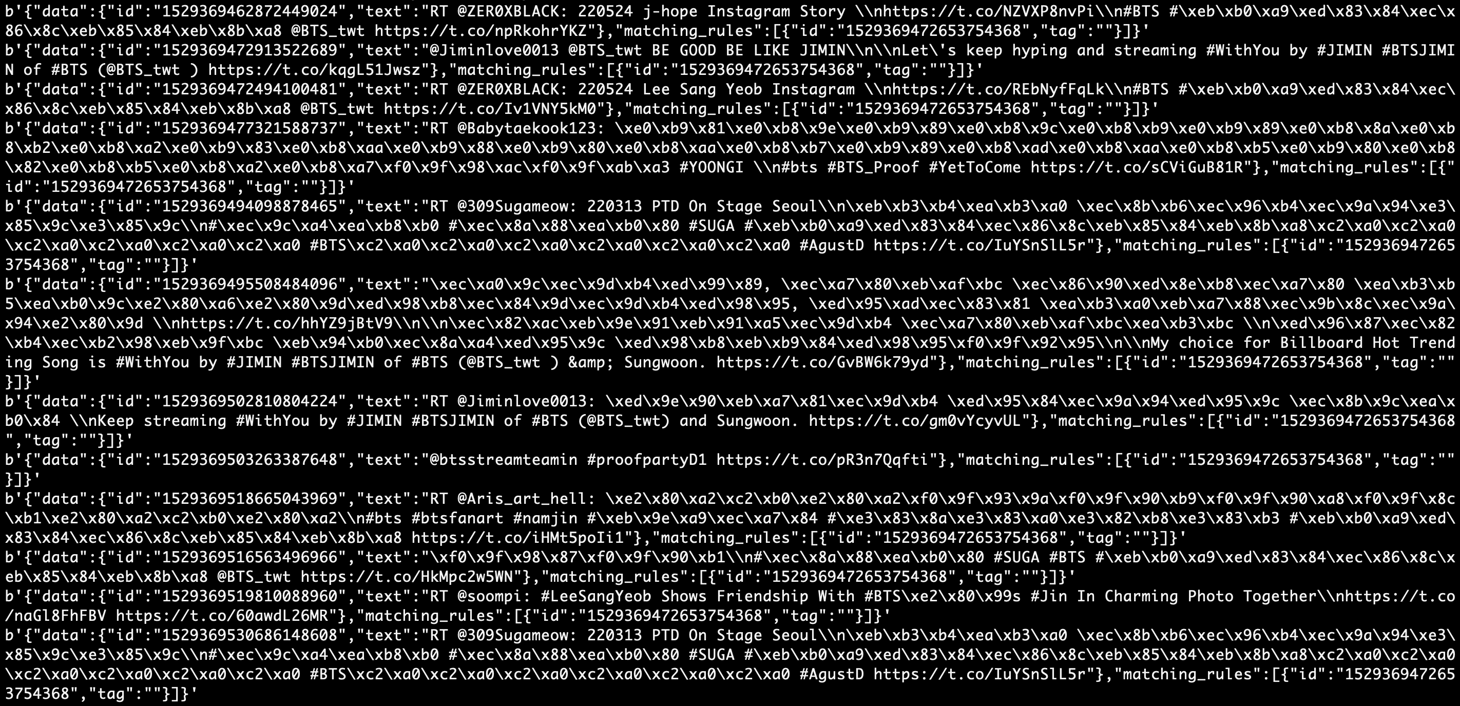 >>> [StreamRule(value='Twitter', tag=None, id='1529086903898632193'), StreamRule(value='BTS', tag=None, id='1529363211085963265')]