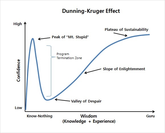 지식과 자신감에 관련된 그래프인데 지식이 얕을 때는 자신감이 충만하다.